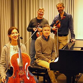 Bildtitel: Spielt zum Notenspur-Salon im Gohliser Schlösschen: Das Leipziger Klavierquartett mit Notenspur-Chef, Prof. Dr. W. Schneider (Mitte)