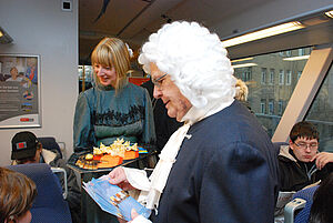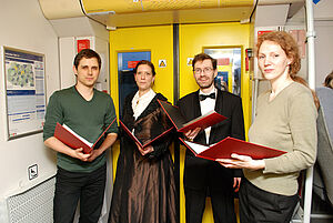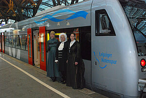 Der 11. Januar war kein gewöhnlicher Reisetag für die Gäste des Notenspur-Zuges der Mitteldeutschen Regiobahn. Diejenigen, die um 16:04 Uhr von Leipzig nach Borna oder um 17:05 Uhr von Borna nach Leipzig fuhren, konnten die Bekanntschaft dreier Größen der Musikgeschichte machen und dazu noch ein kostenloses Konzert genießen. Während der knapp einstündigen Fahrt gaben sich Thomaskantor Johann Sebastian Bach (Franz Schuchart), Pianistin Clara Schumann (Bettina Klohs) und Cecile (Katja Lochner), die Ehefrau des berühmten Dirigenten und Komponisten Felix Mendelssohn Bartholdy, die Ehre. Letztere kam in Vertretung ihres Mannes, der sich entschuldigen musste, da er aufgrund einer Probe mit dem Gewandhausorchester unabkömmlich war. Begleitet von Darbietungen der Mitglieder des Ensemble TonART Leipzig e.V. (Daniel Grabic, Bettina Klohs, Robert Urmann und Kristin Börjesson), das mit heiteren A-cappella-Stücken brillierte, verteilten die drei Kostümierten Pralinen an die Fahrgäste. Nebenbei informierten sie die Mitreisenden über die anstehenden Notenspur-Salons im Februar. So wurde die Reise für alle zu einer kurzweiligen Fahrt durch die Musikgeschichte Leipzig von Damals bis Heute.